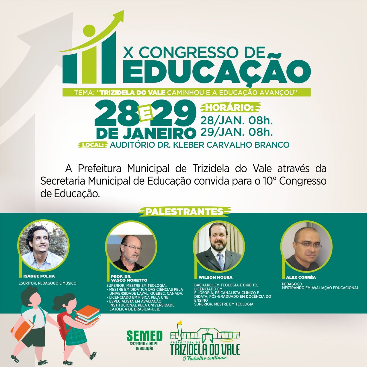Para valorizar e compartilhar experiências inspiradoras dos educadores das escolas municipais, a Secretaria Municipal de Educação de Trizidela do Vale organiza mais uma edição do Congresso de Educação. O evento acontecerá no Auditório Dr. Kleber Carvalho Branco, nos dias 28 e 29 de janeiro, a partir das 08h.