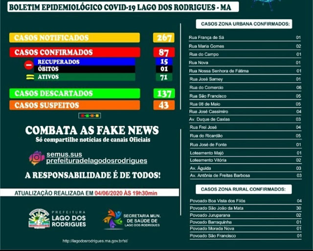 Lago dos Rodrigues conta atualmente com 71 casos confirmados ativos de coronavírus e 15 pacientes curados.
